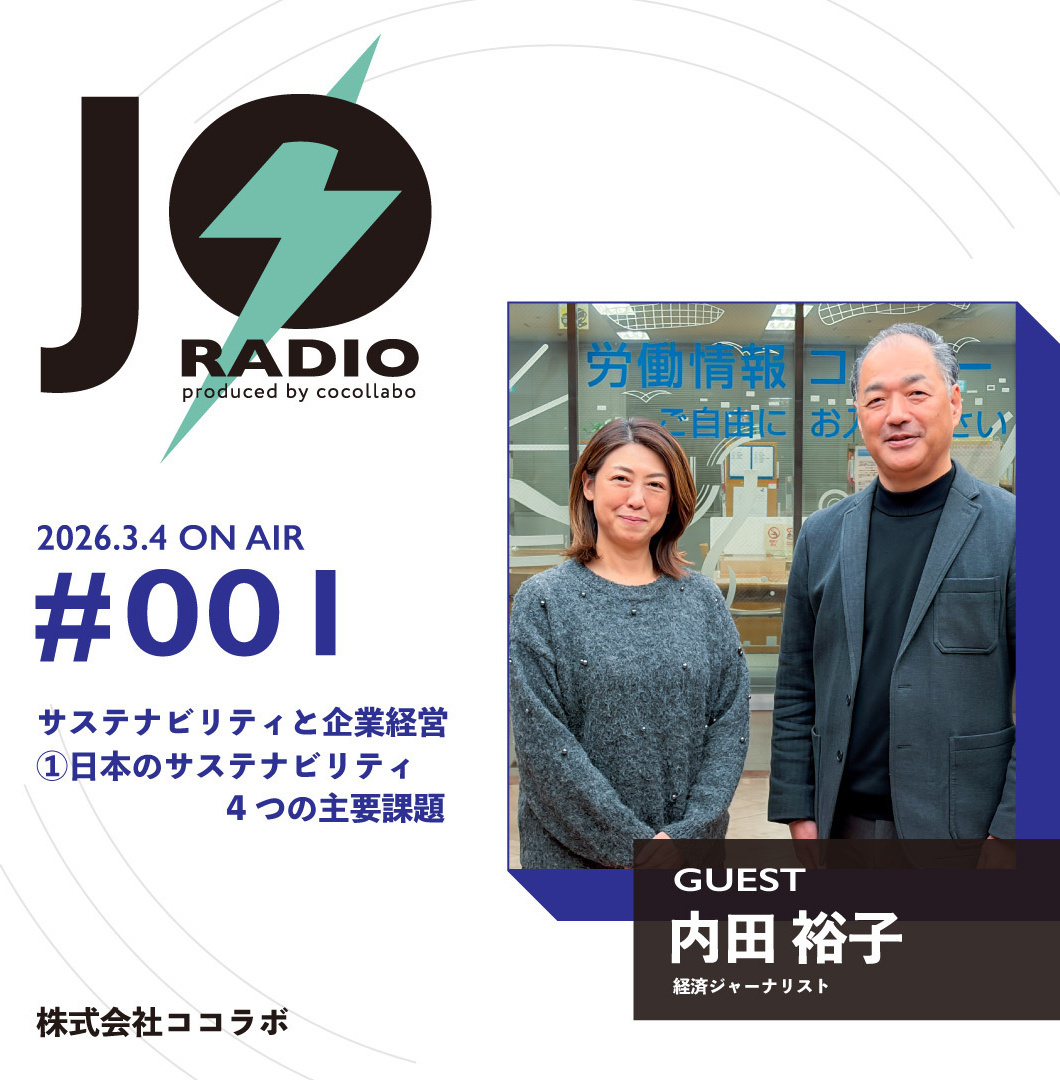 ココラボJOラジオ、記念すべき第1回の放送は、ゲストに経済ジャーナリストの内田裕子さんをお迎えして、サステナビリティと企業経営について、全4話でお届けします。第1話は、日本のサステナビリティ4つの主要課題についてお届けします。