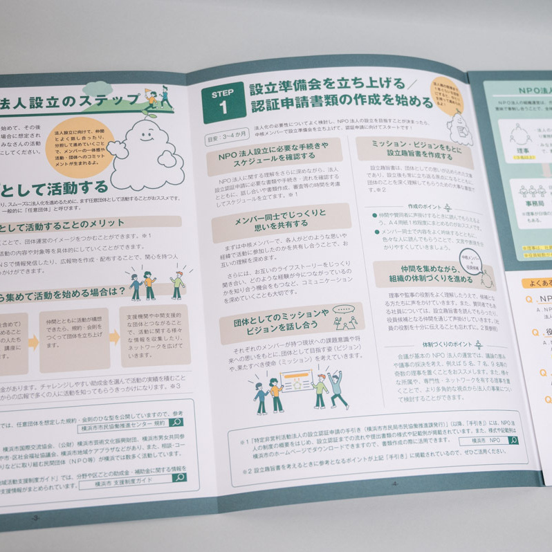 横浜市の市民活動のコーディネーター役を担う市民協働推進センターの活用方法を掲載したミニハンドブック。サステナビリティを意識したナチュラルカラーを基本とし、市民活動を育成する同センターの役割を、タネに水をまく「雲」のキャラクターで表現しました。