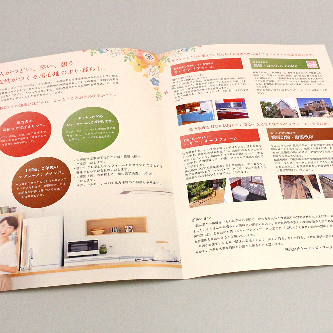 女性だけの建築会社という同社の特徴を、北欧デザイン風のテクスチャーと温かみのある色使いで表現。中面には新築やリフォーム後の快適な暮らしが想像できるようなイメージカットとお客様リクエストの花柄をあしらい優しく細やか気遣いのある同社の雰囲気を醸し出しています。